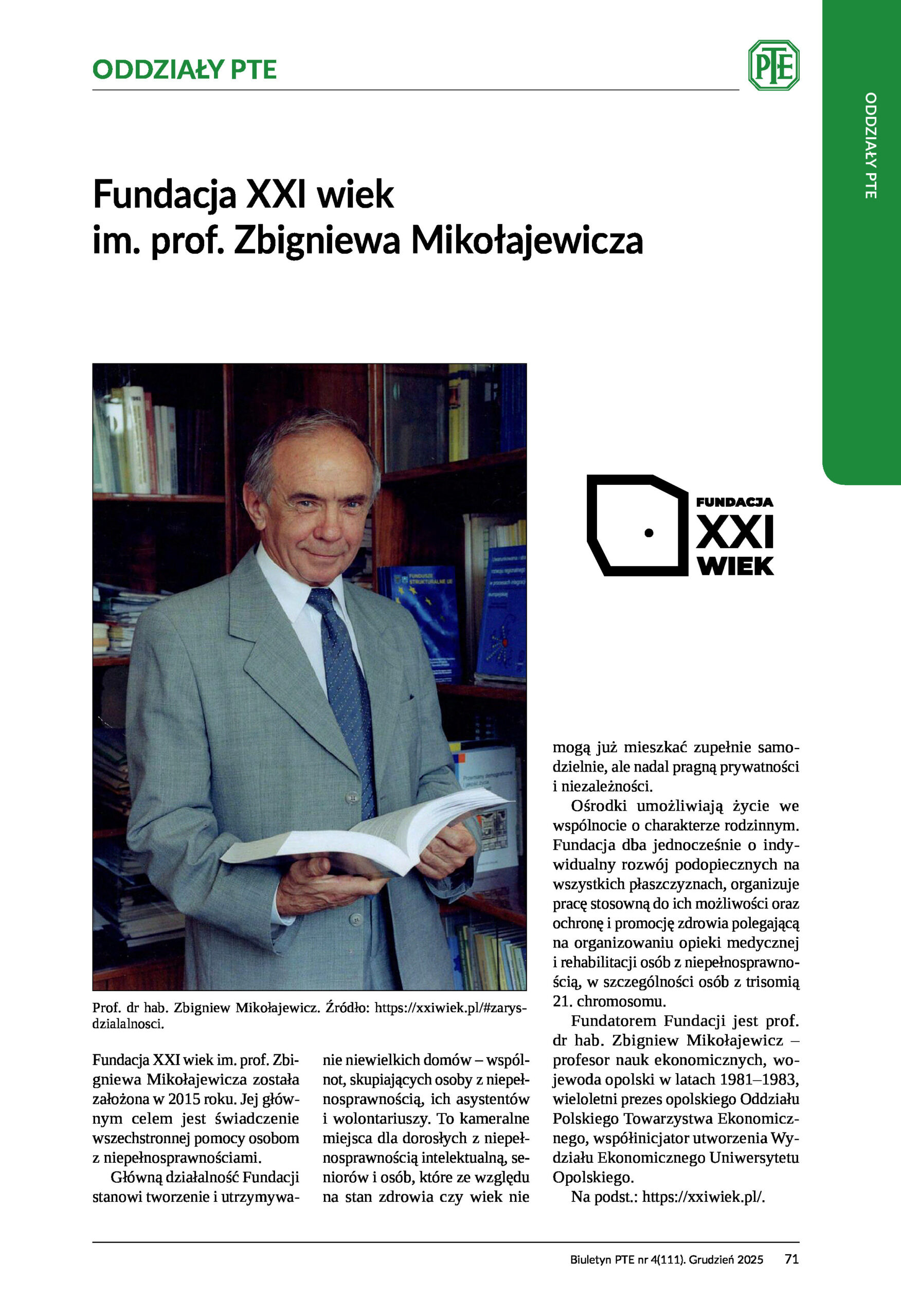 Z wielką satysfakcją i radością miło nam powiadomić Państwa, że w ostatnim numerze „Biuletynu PTE” 4/2025r. ukazała się informacja o naszej Fundacji XXI wiek oraz o Fundatorze – Panu Profesorze Zbigniewie Mikołajewiczu.